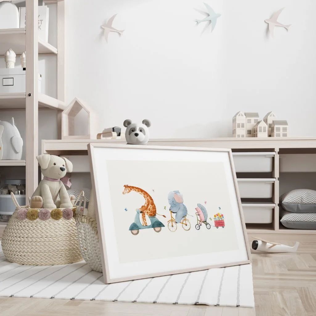 Animals on a Ride Poster is delicate kids wall art in a light watercolour style, featuring a charming scene: a giraffe on a scooter, an elephant on a bicycle, and a hedgehog on a tricycle pulling a little cart filled with colourful flowers. The airy, bright composition with plenty of “breathing space” looks beautiful above a cot, in a play corner, or in a preschool setting. Soft pastel tones and a storybook mood help create a cosy, calm interior that feels warm and welcoming.