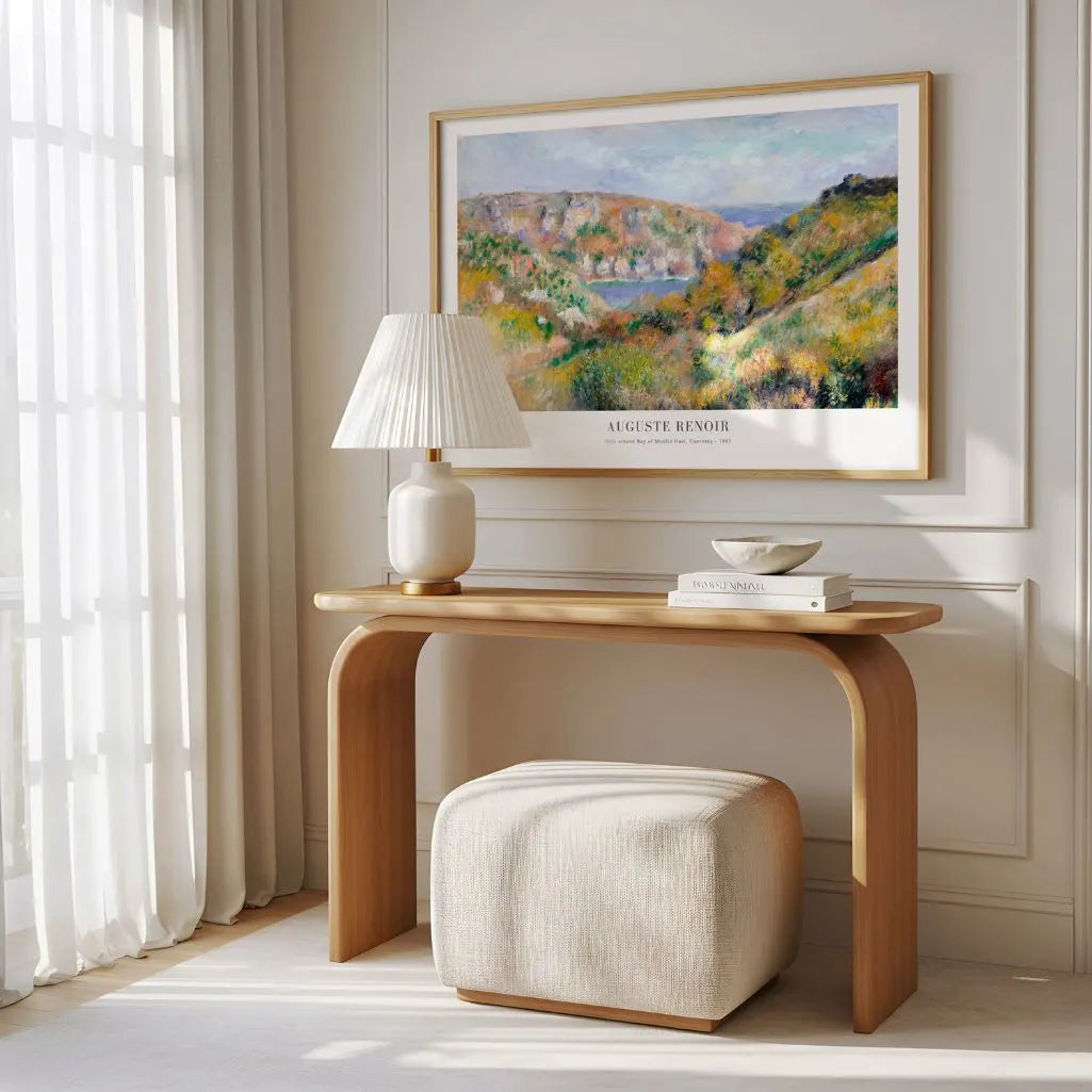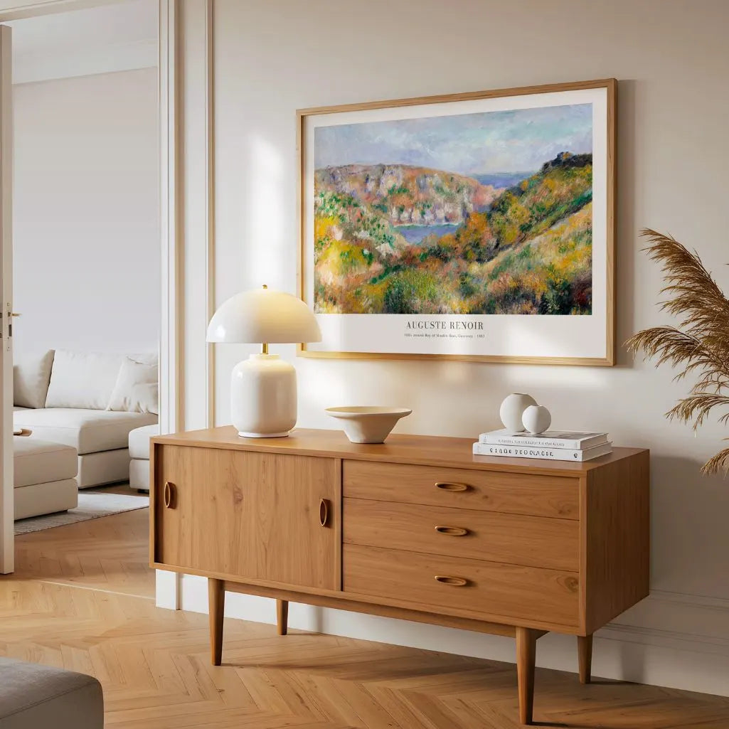 Renoir’s pastel palette and fluid brushwork create a dreamy harmony that’s easy to live with, making this a beautiful choice for French-inspired, boho, or classic interiors. The horizontal format is ideal above a sofa, sideboard, or bed, adding light without overwhelming the room. Choose a framed poster for a polished, gallery-ready finish, or an unframed print for a clean, contemporary look that keeps the landscape open and relaxed.