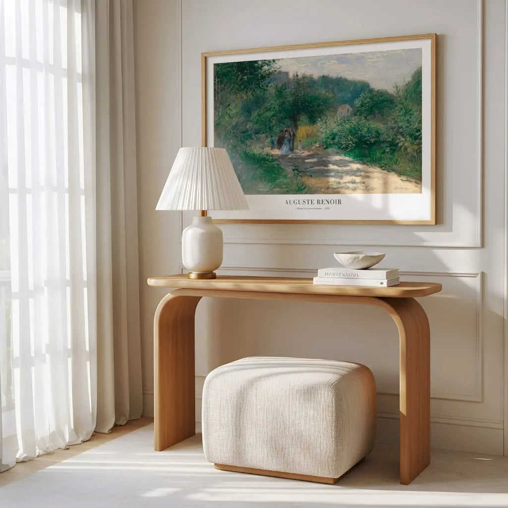 Bring quiet countryside elegance to your home with this horizontal-format Auguste Renoir A Road in Louveciennes poster. Painted early in his career, it captures walkers under trees in soft, dappled light—classic impressionist wall art that feels gentle, natural, and effortlessly timeless.