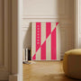 A Bauhaus-style poster featuring vertical pink stripes and a diagonal line—symbolising order, motion, and harmony. The bold composition in pink and beige tones fits beautifully within modernist minimalism, adding rhythm and structure without overwhelming the space. Perfect for modern, artistic, and Scandinavian interiors, this wall art works well in living rooms, bedrooms, offices, or creative studios. Printed on premium paper for intense colour, crisp detail, and an elegant finish. Available as a framed poster or an unframed print.