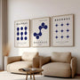 This Set of 3 wall art prints explores Bauhaus ideas of rhythm and repetition through dot motifs and modular, organic forms. Deep navy shapes balance between geometry and fluidity, creating order without strict symmetry on a light neutral background.