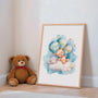 This delicate wall art features a watercolor teddy bear resting on a soft cloud, gently lifted by three pastel balloons in shades of blue, mint, and warm beige. A misty wash of watercolour and tiny decorative details create a calm, storybook atmosphere—full of tenderness, harmony, and soft colour.