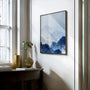 This minimalist landscape wall art features layered mountain silhouettes softened by dense blue mist. A gentle palette of blues and whites creates a quiet, soothing atmosphere—clean, modern, and effortlessly elegant.