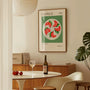 This elegant wall art print celebrates the classic Italian caprese salad—juicy tomatoes, fresh mozzarella, and basil leaves—arranged in an appetising composition against a rich green background. Rendered in a subtle modernist style, the illustration highlights the dish’s simplicity and natural beauty with clean forms and a calm, refined palette. Perfect for kitchens, dining rooms, cafés, or “made in Italy” inspired interiors, this artwork brings freshness and visual balance to your space. Display it as a framed poster for a polished look or choose a premium unframed print for a crisp, gallery-style finish.