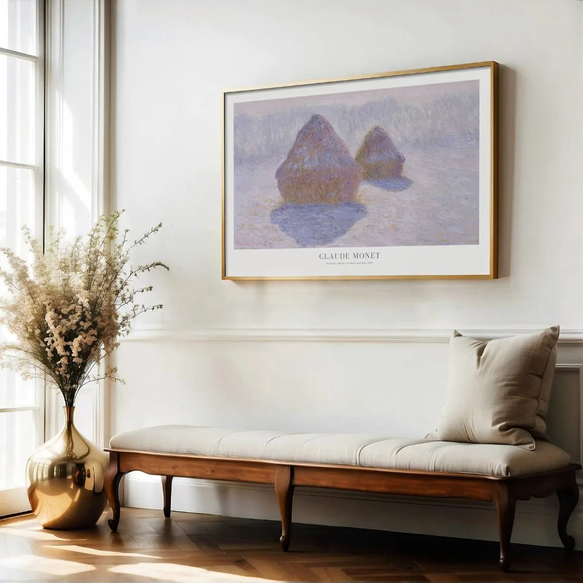 This Claude Monet poster features Haystacks (Effect of Snow and Sun) (1891), one of the most celebrated works from the Haystacks series—Monet’s famous exploration of how light transforms the same subject across seasons and hours. Here, two snow-covered stacks glow under winter sun, creating wall art that feels quiet, radiant, and deeply atmospheric.