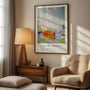 Bold red boats stand out against blue-violet tones in the water and the fresh greens of nearby vegetation, creating a lively composition full of movement and warmth. It’s the perfect choice for art-forward, modern, or French-inspired interiors—bringing energy without feeling heavy. Display it as a framed poster for a crisp, gallery-ready statement, or choose an unframed print for a relaxed, airy look.