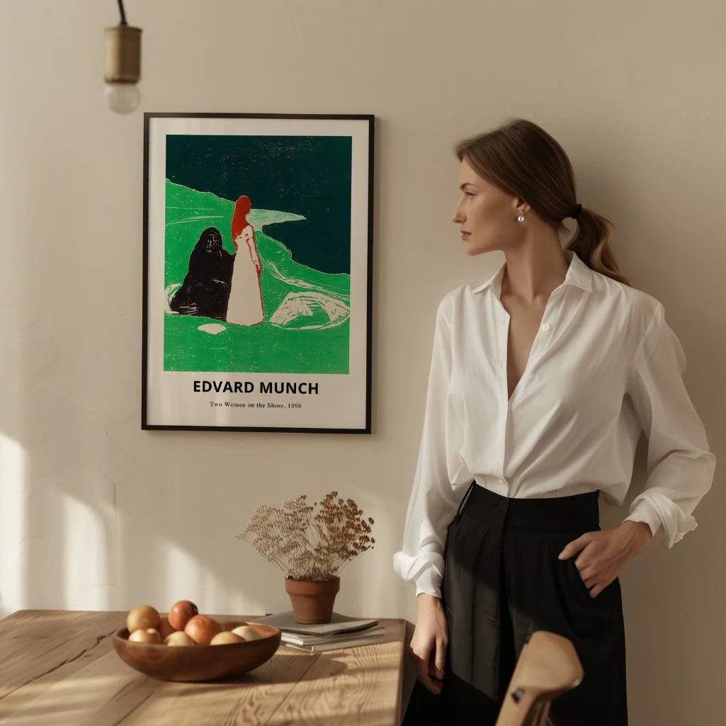This Edvard Munch poster features Two Women on the Shore (1898), a hauntingly poetic work where symbolism and emotion meet. Two figures stand by the water in a scene often read as a contrast of life and death, light and shadow—an intimate moment filled with tension, stillness, and introspection. The expressive forms and mood make this wall art a powerful statement for anyone drawn to symbolist and early expressionist art.