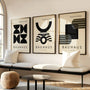 Semi-circles, bands, and solid colour blocks build strong, architectural compositions, while a restrained palette of black, warm beige, and olive tones adds timeless modernist clarity. Display the trio as a cohesive framed poster set for a refined statement wall, or choose each piece as an elegant unframed print for a lighter, minimalist finish. Ideal for contemporary and minimalist interiors, home galleries, creative offices, and spaces inspired by 20th-century design history.