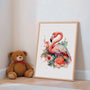 Flamingo in Flowers Poster is watercolor wall art featuring a graceful flamingo surrounded by blossoms. Juicy coral and pink tones combined with soft green leaves create a vibrant yet airy composition that instantly lifts the room. The floral frame adds elegance and freshness while keeping the overall look light, making it a striking accent without visual heaviness.