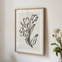 A refined piece of wall art featuring delicate tulips and a subtle flower drawn in a single continuous line. The simple composition and muted tones create a modern, airy look that blends effortlessly with modernist, Scandinavian, boho, and japandi interiors. Line art brings harmony and lightness to a space while keeping the overall feel clean and contemporary. Display it as a framed poster for a polished, gallery-ready finish, or choose an unframed print for a crisp, minimalist look. Ideal for the living room, bedroom, office, or hallway.
