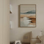 Create a quiet, airy atmosphere with this framed canvas print featuring a minimalist watercolor landscape. Soft beiges, misty greys, and warm browns shape a gentle mountain line and a calm water surface that fades into natural-looking haze. The smooth transitions of color bring openness and balance, while the watercolor style adds organic elegance without extra detail.
