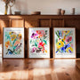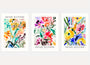 This Set of 3 wall art prints features lush bouquets and free-flowing botanical motifs in an expressive, painterly style inspired by Henri Matisse. Watercolour-like blends and spontaneous lines create a sense of movement, with rich reds, pinks, yellows, blues, greens, and bright accent tones on a light background.