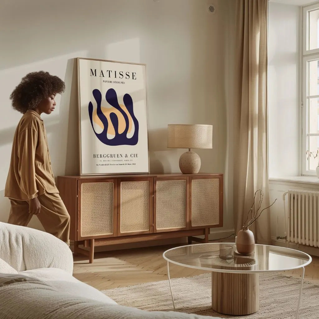 Inspired by Henri Matisse’s iconic Papiers Découpés, this Poster features a flowing, wave-like abstract form in deep navy, set against warm beige with orange accents. The composition captures motion, energy, and artistic freedom—bold in contrast, yet balanced and elegant.