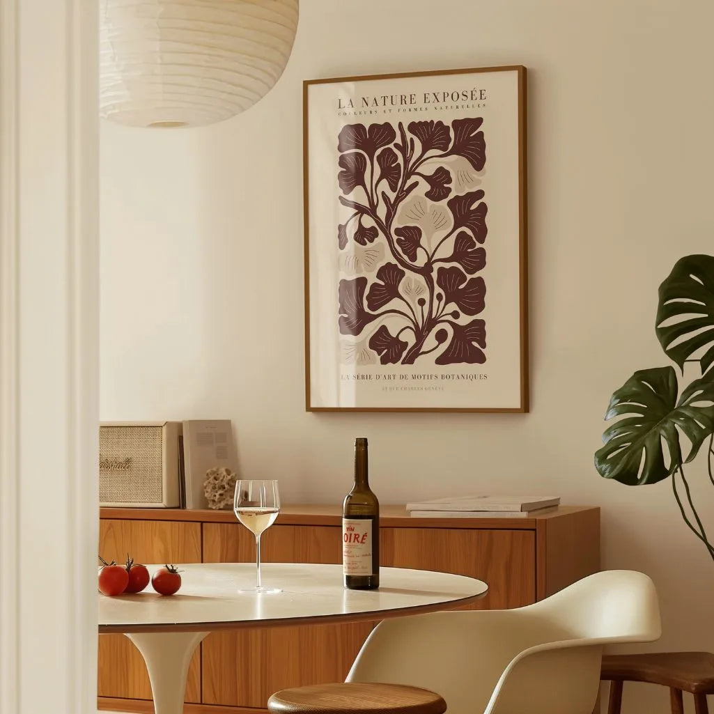 La Nature Exposée is a refined botanical wall art print featuring stylised ginkgo leaves in warm beige and brown tones. The minimalist, geometric plant composition feels modern yet subtly retro, with a French-inspired sense of restraint and design clarity.