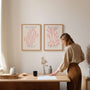 This set of two wall art prints is inspired by Henri Matisse’s cut-out technique, featuring light organic shapes in a soft pastel pink palette. The flowing lines and minimalist composition create a gentle, artistic presence that feels calm, elegant, and beautifully balanced.