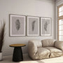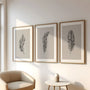 This minimalist set of three feather art prints features refined hand-drawn feather illustrations in soft neutral tones. Delicate linework and organic forms create a calm, balanced aesthetic inspired by lightness, movement, and natural simplicity.