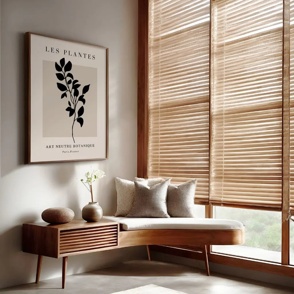 A refined piece of wall art rooted in modernist minimalism, featuring a bold black plant silhouette on a warm beige background. Clean lines and graphic simplicity create a calm, balanced composition with a subtle botanical edge. Perfect for modern, Scandinavian, and neutral interiors, this artwork adds harmony and a quietly confident statement without visual clutter. Display it as a framed poster for a polished, gallery-ready finish, or choose an unframed print for a clean, contemporary look. An ideal choice for anyone who loves timeless botanical design in muted tones.