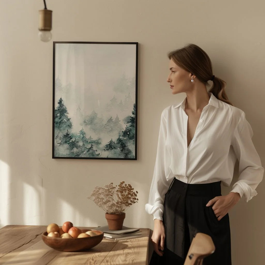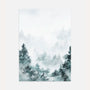 Misty Forest Watercolor Poster is subtle landscape wall art featuring a foggy conifer forest in cool shades of grey and green. Soft washes, gentle tonal transitions, and a misty atmosphere create an airy composition that brings calm and a sense of space to your interior. The quiet nature mood makes it an effortless fit for Scandinavian, japandi, minimalist, and contemporary rooms.