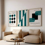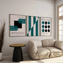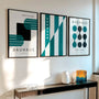 A cool palette of turquoise and deep green set against a neutral background creates a calm, modern atmosphere with strong design clarity. Display the trio as a cohesive framed poster set for a gallery-style effect, or choose each piece as an elegant unframed print for a lighter, graphic presentation. Ideal for living rooms, offices, studios, bedrooms, and creative spaces inspired by modernism, minimalism, and mid-century design—where rhythm, structure, and clean form define the interior.