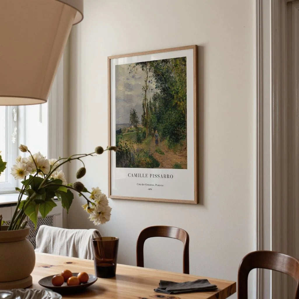 Bring a sense of quiet countryside calm to your walls with Camille Pissarro’s Cote des Grouettes, Pontoise. This portrait-format impressionist landscape captures the rolling hills of Pontoise—one of the places closest to the artist’s heart—painted with soft light, gentle brushwork, and a soothing harmony of greens.