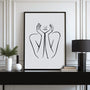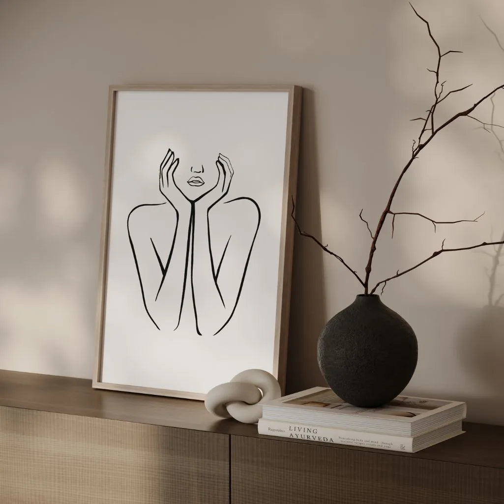 “Thoughts in Silence” is minimalist wall art capturing a female figure in a gentle, contemplative gesture. The clean line creates a modern, elegant composition that feels intimate and emotional while staying airy and understated—perfect for interiors that value calm over clutter.