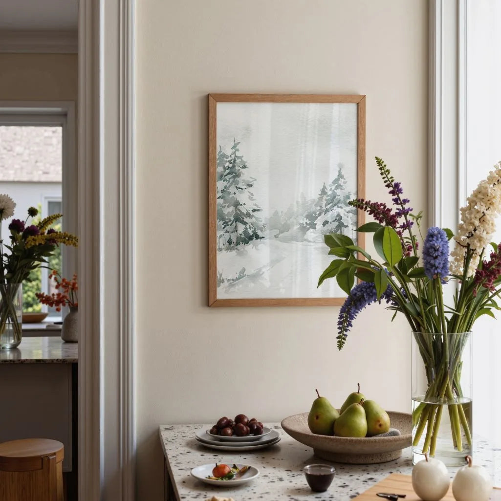A calming piece of wall art featuring a delicate watercolour winter forest scene, where a snow-covered path winds between frosted fir trees. Cool tones of white, soft grey, and muted green create a quiet landscape filled with stillness and subtle winter magic. Perfect for scandi, hygge, japandi, and minimalist interiors, this artwork brings a natural, soothing presence and refined simplicity to your space. Display it as a framed poster for a polished, gallery-ready finish, or choose an unframed print for a clean, contemporary look.