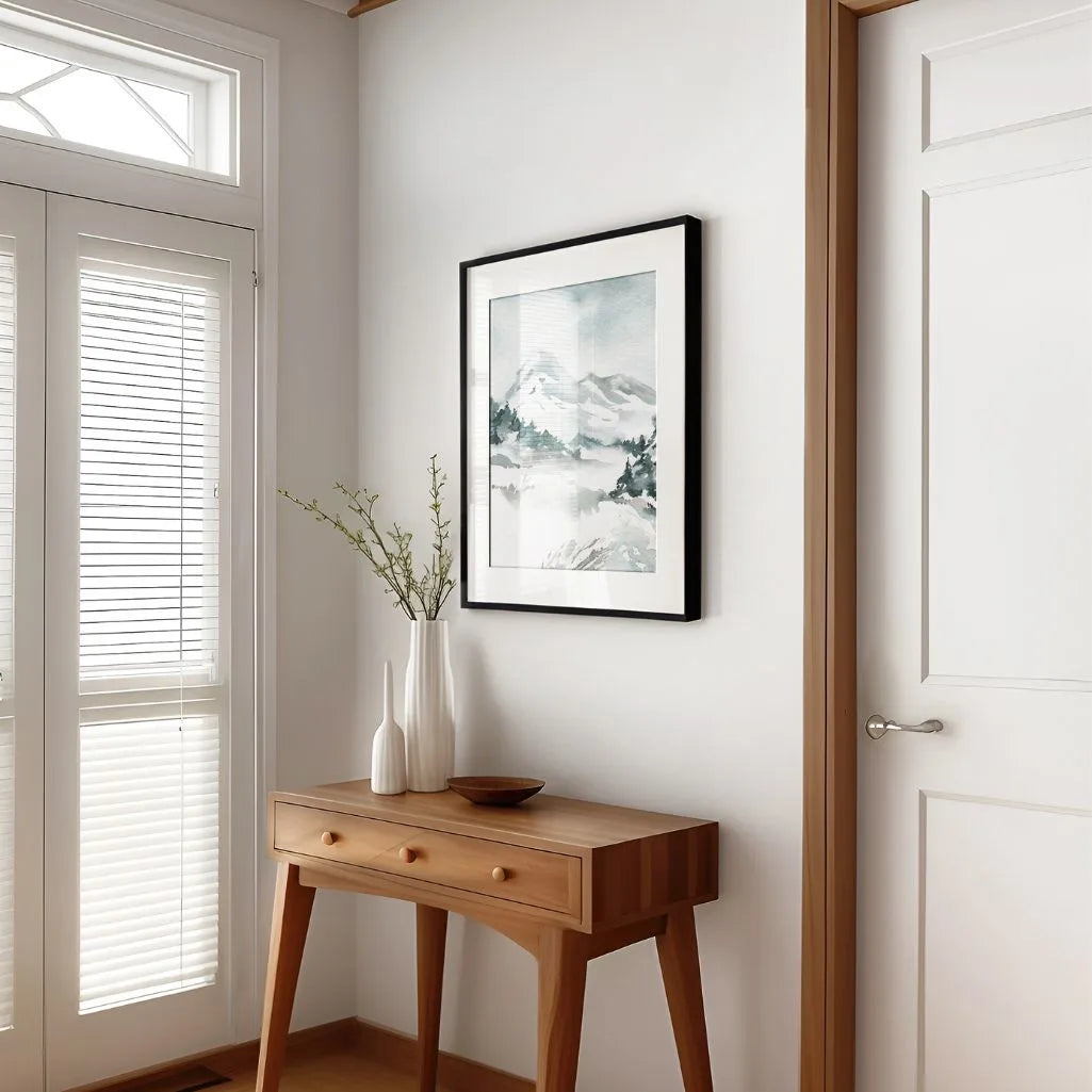 A serene piece of wall art featuring a delicate watercolour landscape of snow-covered mountain peaks, frozen forests, and cool mist drifting through the scene. Soft greys, icy blues, and crisp whites create a quiet atmosphere of stillness and natural balance. Perfect for scandi, japandi, minimalist, and modern interiors, this artwork brings freshness and understated elegance without overpowering the room. Display it as a framed poster for a polished, gallery-ready finish, or choose an unframed print for a clean, contemporary look.